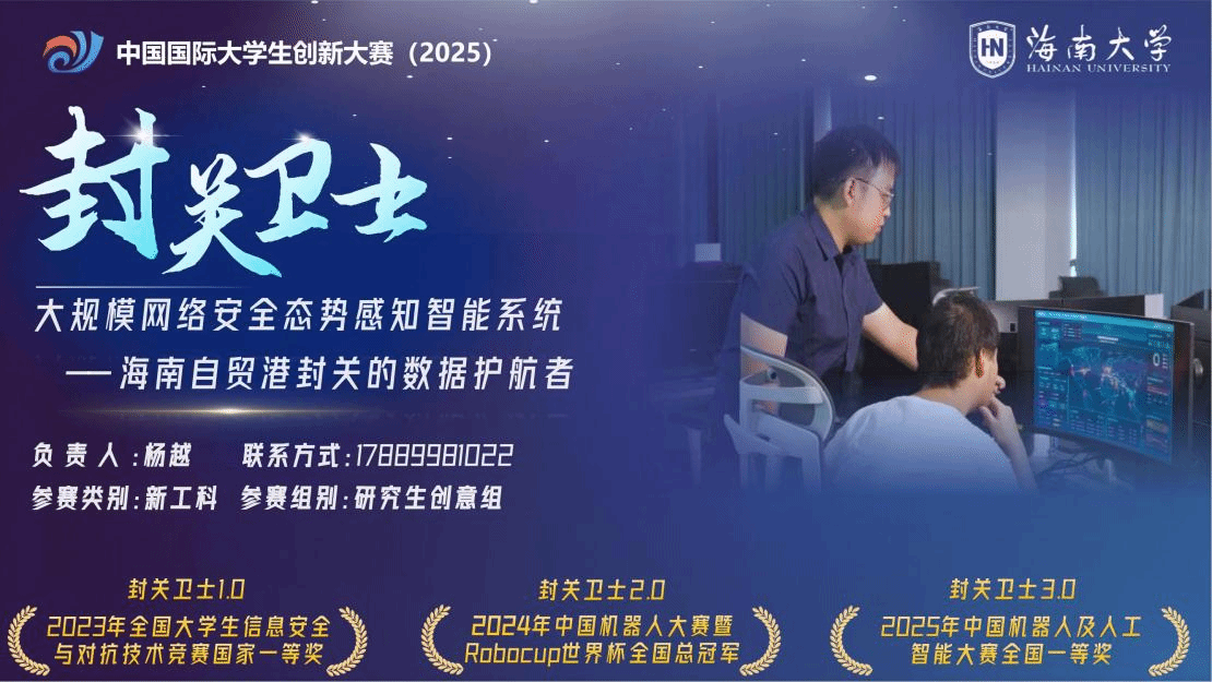2025年10月12日至15日,中国国际大学生创新大赛(2025)总决赛在郑州举行,我院程杰仁教授指导,新进教师杨越(时为我校2021级博士)及14名本硕学生共同完成的参赛作品《封关卫士—大规模网络安全态势感知智能系统》在高教主赛道研究生创意组中脱颖而出,最终斩获全国银奖。